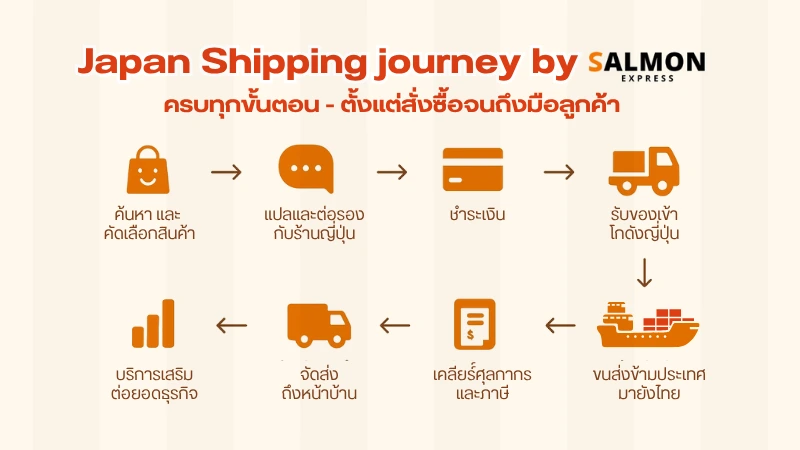 SALMON EXPRESS ตอบโจทย์ความต้องการนี้ด้วยบริการ Japan Shipping แบบครบวงจร ที่ออกแบบมาเพื่อทำให้ทุกขั้นตอนเป็นเรื่องง่ายสำหรับคุณ จบครบในที่เดียว ไม่ต้องเหนื่อยกับการประสานงานหลายฝ่าย มาดูกระบวนการทำงานตั้งแต่เริ่มต้นจนถึงส่งมอบสินค้าถึงมือลูกค้ากันเลย